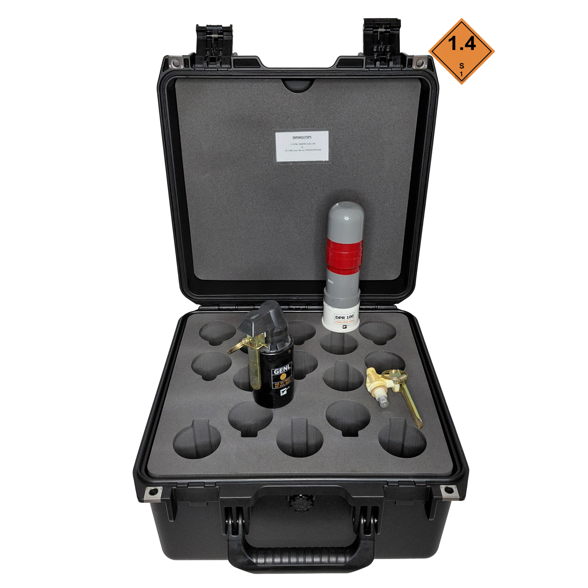 Valise Peli™ IM2275 avec usinage de mousse pour 5 GR GENL/GMD avec BAM et 10 CM6 avec BAM et /ou DPR50 et DPR1005 GR GENL/GMD. Réduit la classe de risque ONU de1.1B à 1.4S, améliorant ainsi la sécurité du personnel lors du stockage et du transport de grenades. La IM2275P5 de Cirra Packaging est une caisse de transport haute capacité pour grenades, dotée d’une coque renforcée, d’une fermeture multi-points et d’un calage intérieur personnalisable.