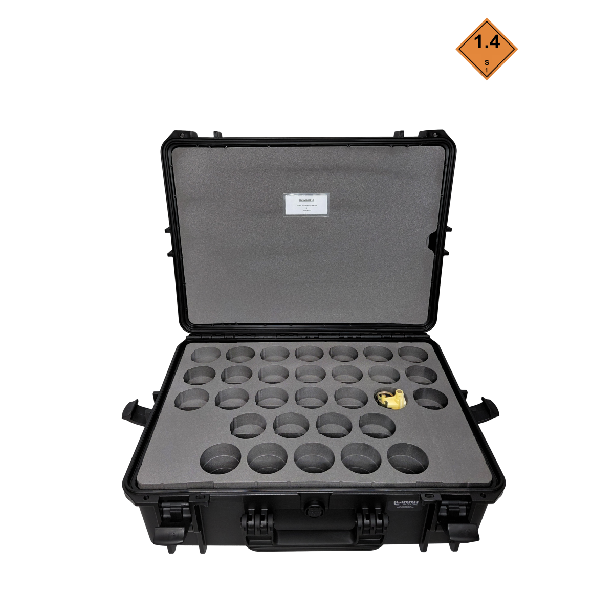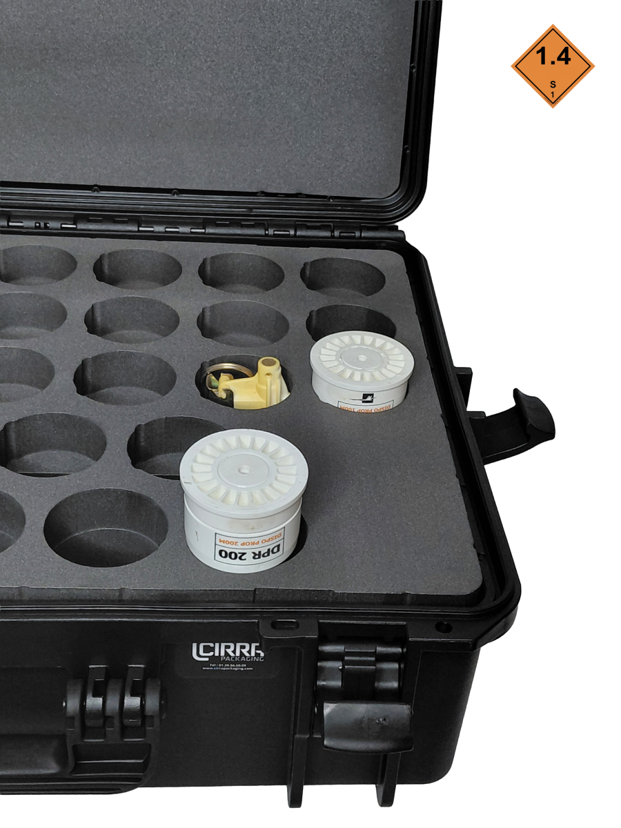 Valise MAX505P10 avec usinage de mousse pour MAXCASE 505 / 25 BAM ou DPR50 ou DP100 et 5 DRP200. Réduit la classe de risque ONUde1.1B à 1.4S,améliorant ainsi la sécurité du personnel lors du stockage et du transport de grenades. La MAX505P10 est une caisse compacte, étanche et renforcée, conçue par Cirra Packaging pour le transport sécurisé de grenades avec mousse sur mesure.
